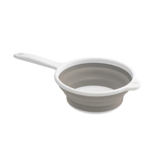 Una volta utilizzato si ripiega su se' stesso grazie alla parte in gommo morbida, abbattendo i volumi di ingombro sullo scolapiatti.