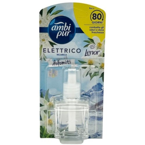 La ricarica elettrica Ambi Pur con profumazione Dolomiti, in collaborazione con Lenor, combatte efficacemente i cattivi odori e dona una fresca fragranza ispirata all'aria pura e incontaminata delle Dolomiti.