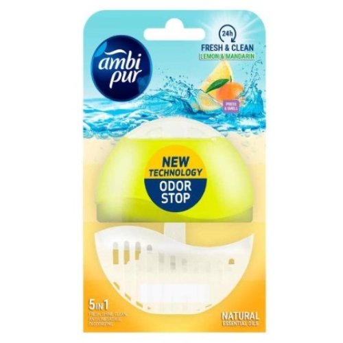 Scopri la freschezza agrumata del nuovo profumatore per WC Ambi Pur Odor Stop Lemon & Mandarin. Grazie alla sua tecnologia Odor Stop 5 in 1, neutralizza efficacemente i cattivi odori e diffonde un piacevole profumo di limone e mandarino fino a 24 ore al giorno.