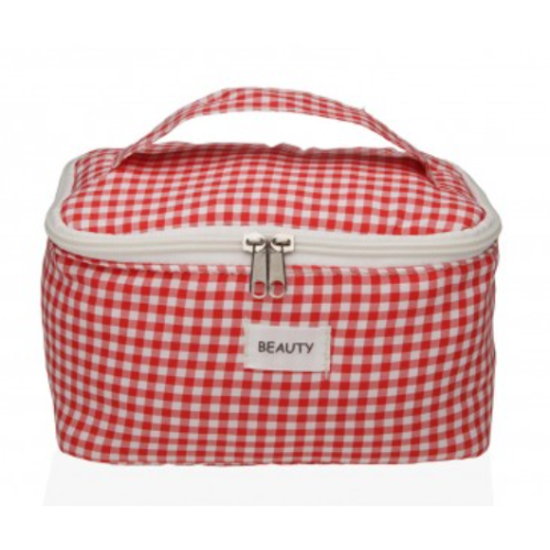 Questo beauty case presenta una stampa a quadretti vichy in tonalità rosso e bianco, un classico motivo che richiama lo stile rétro e primaverile. È ideale per contenere prodotti di bellezza, accessori o piccoli oggetti personali.