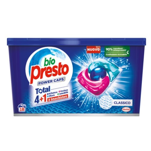 Bio Presto Power Caps Total 4+1 Classico è la soluzione completa per il bucato quotidiano. Le sue capsule monodose sono pratiche, efficaci e rispettose dell’ambiente. La formula innovativa 4+1 azioni offre un risultato impeccabile ad ogni lavaggio: