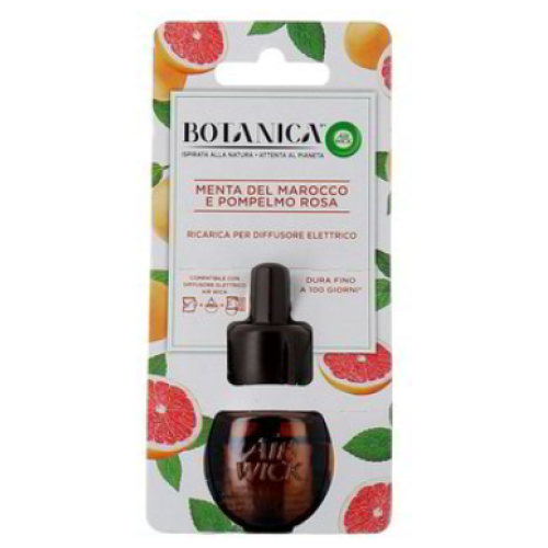 È una ricarica per diffusore elettrico della linea Botanica by Air Wick, fragranza “Menta del Marocco e Pompelmo Rosa”. Contiene oli essenziali: la menta del Marocco raccolta a mano, arricchita dal profumo del pompelmo rosa.