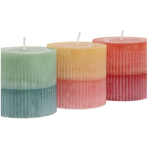 3 candele in cera di dimensioni compatte 7 x 7 x 7 cm e peso di 220 grammi ciascuna, disponibili in tre varianti di design.