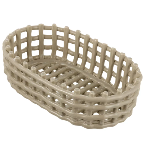 Il cestino ovale in porcellana tortora è un elegante complemento d'arredo per la tavola, ideale per servire pane, frutta o come elemento decorativo. Realizzato in porcellana di alta qualità, presenta una finitura lucida che ne esalta la tonalità tortora, conferendo un aspetto raffinato e moderno.