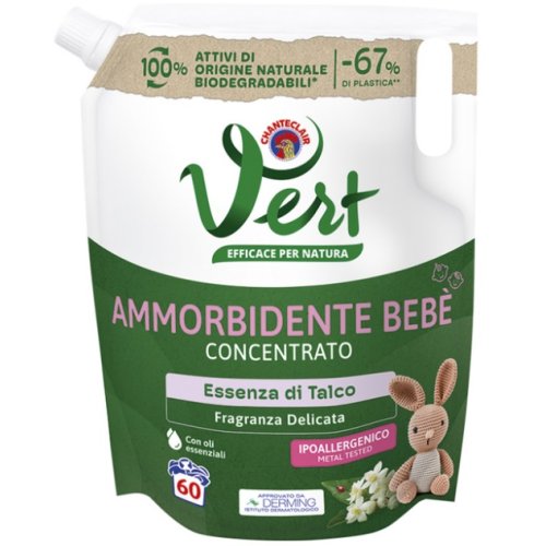 Chanteclair Vert Ammorbidente Bebè è appositamente studiato per i capi dei più piccoli. La sua formula ipoallergenica e dermatologicamente testata lo rende delicato sulla pelle sensibile dei neonati e dei bambini, garantendo al tempo stesso morbidezza e un profumo leggero e rassicurante di talco.