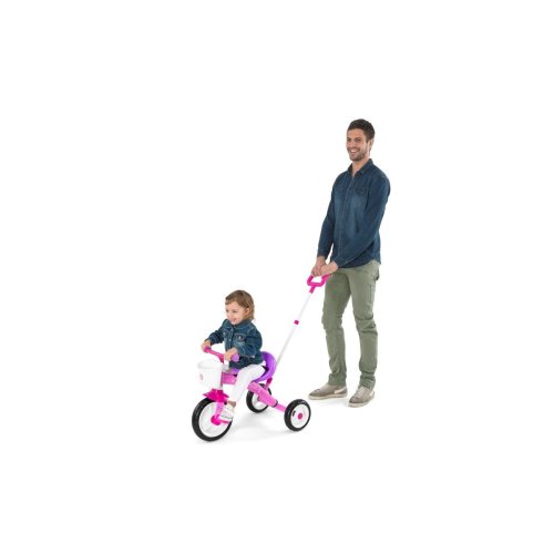Cintura di sicurezza e pratico maniglione estensibile permettono all'adulto di spingere e guidare il triciclo