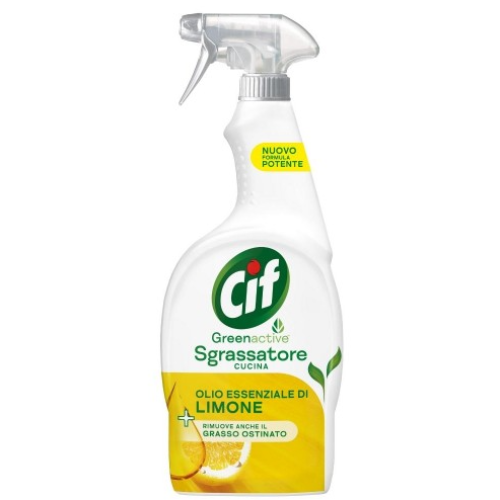 È uno spray sgrassatore per la cucina con olio essenziale di limone. Fa parte della linea Greenactive di Cif, che enfatizza l’uso di ingredienti naturali e un minor impatto ambientale.