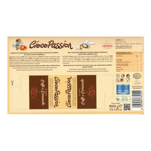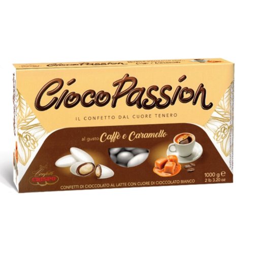 I Confetti Crispo Ciocopassion Gusto Caffè e Caramello (confezione da 1 kg) sono una prelibatezza dolciaria che combina l'eleganza del confetto con il piacere del cioccolato e sapori intensi.