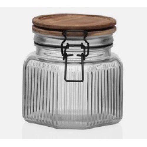 Realizzato in vetro trasparente resistente, permette di identificare facilmente il contenuto, mentre il coperchio in legno con guarnizione assicura una chiusura ermetica, mantenendo intatti aromi e freschezza.