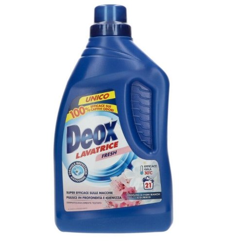 Il detersivo Deox Lavatrice Fresh è studiato per offrire una pulizia profonda e igienizzante, anche a basse temperature (già da 30°C). Grazie alla sua formula brevettata antiodore, è 100% efficace contro i cattivi odori ed è dermatologicamente testato.
