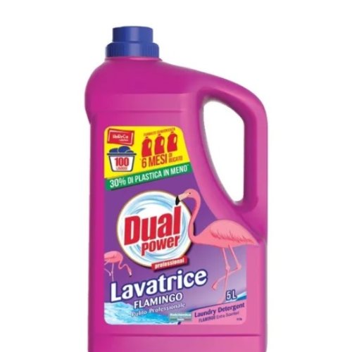 Dual Power Lavatrice Flamingo è un detersivo liquido professionale per lavatrice, pensato per offrire pulizia profonda e profumo intenso con ogni lavaggio. Grazie alla sua formula concentrata e altamente efficace, è ideale per famiglie numerose o per chi lava frequentemente.