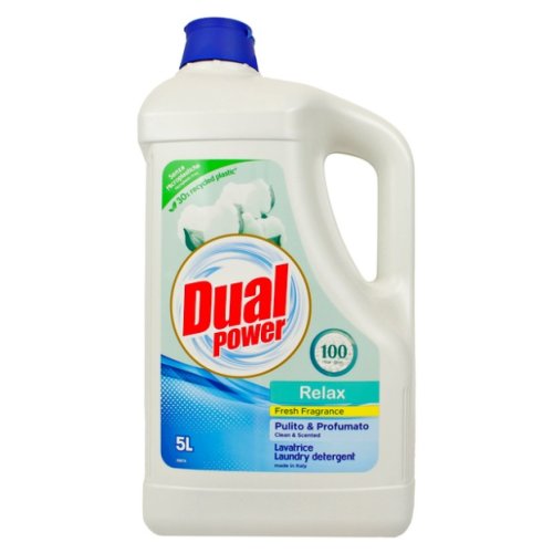 Dual Power Relax è un detersivo liquido per lavatrice in formato grande da 5 litri, progettato per garantire fino a 100 lavaggi. La sua formula pulente e profumata assicura un bucato fresco e impeccabile, lasciando un aroma delicato e rilassante sui tessuti. Il prodotto è realizzato in Italia, con un packaging ecologico contenente il 30% di plastica riciclata, contribuendo così alla sostenibilità ambientale.