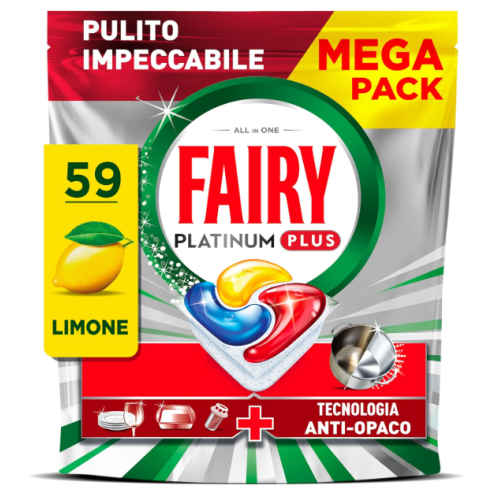 Le capsule Fairy Platinum Plus Limone nel formato da 59 pezzi sono pastiglie per lavastoviglie "All in One" progettate per rimuovere lo sporco ostinato fin dal primo lavaggio e restituire brillantezza alle stoviglie opacizzate.