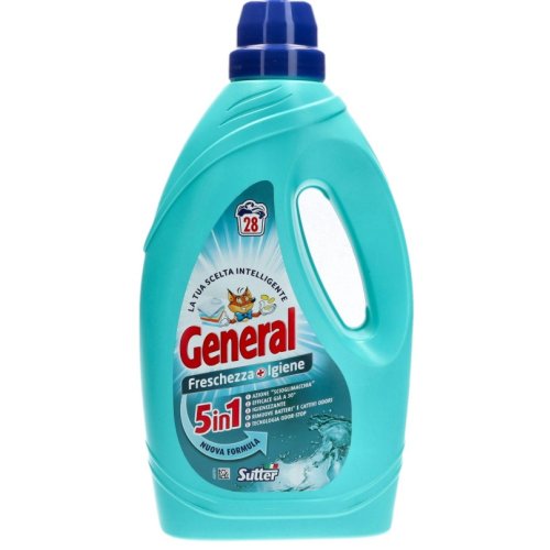 General Detersivo Freschezza e Igiene 28 Lavaggi è un detersivo liquido per bucato formulato per garantire una pulizia profonda e un’igiene completa dei tessuti.