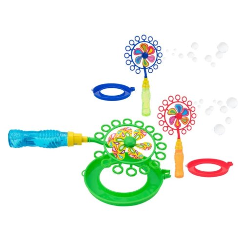 Questa girandola con bolle è un giocattolo estivo e primaverile che offre un doppio divertimento ai bambini. Quando esposta al vento o fatta girare a mano, la parte superiore gira su se stessa; immergendo le palette nell'apposito liquido, il movimento genera automaticamente un flusso continuo di bolle di sapone.