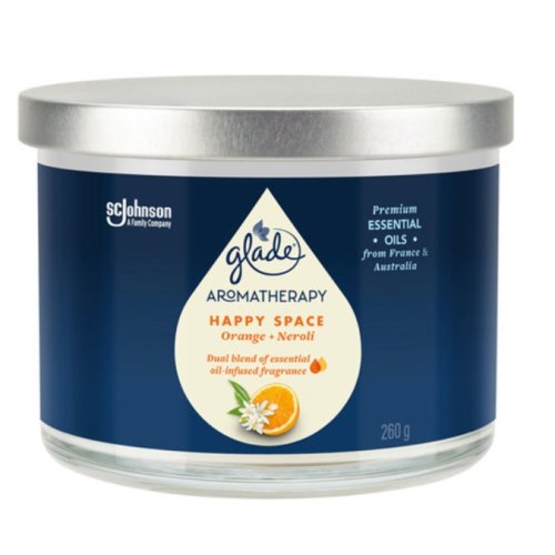 La candela profumata Glade Aromatherapy Happy Space Orange + Neroli è un prodotto pensato per creare un ambiente rilassante e positivo in casa. Questa candela è infusa con una miscela doppia di oli essenziali di alta qualità provenienti da Francia e Australia, tra cui arancia dolce e neroli, noti per le loro proprietà aromatiche che favoriscono il buonumore e la sensazione di benessere.