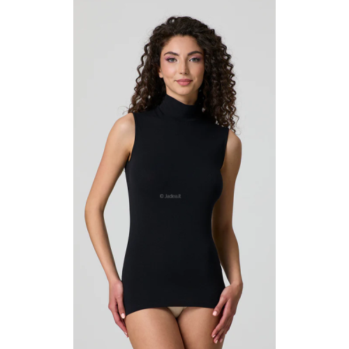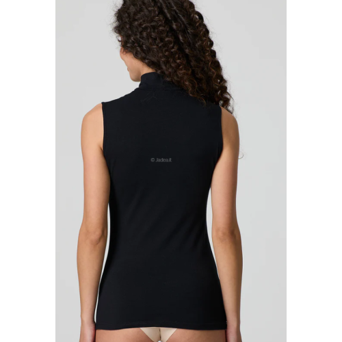 Lupetto smanicato, realizzato in cotone elastico. Completamente adattabile alle curve del corpo, ideale come raffinato sotto giacca.