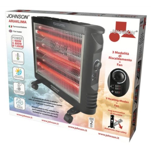 ARIAKLIMA la stufa al quarzo di JOHSON Elettrodomestici compatta adatta per applicazioni domestiche e commerciali quando è necessario un caldo istantaneo, anche in ambienti con bassa temperatura o in locali a contatto diretto con l'esterno. ARIAKLIMA è facile da trasportare e posizionare ovunque vogliate e grazie alla possibilità di scegliere la potenza, 400 W , 800 W e 1200W la rende adatta a ogni situazione.