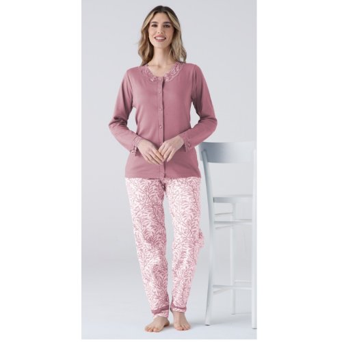 Il pigiama donna lungo 4127LAPLDA è pensato per offrire massimo comfort nelle serate più fredde, senza rinunciare a un tocco di femminilità. Realizzato in tessuto caldo e morbido, ideale per la stagione autunno/inverno, questo pigiama presenta una maglia a maniche lunghe con dettagli curati come piccoli motivi decorativi abbinata a pantaloni lunghi coordinati con vita elasticizzata. La vestibilità comoda e il taglio classico lo rendono un capo perfetto per il relax serale e il riposo notturno.