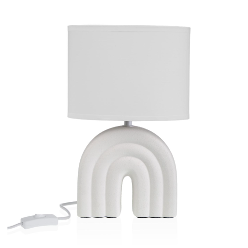 - Design e Materiali: La base è realizzata in ceramica bianca con finitura lucida, abbinata a un paralume cilindrico in tessuto (misto cotone/poliestere) che ammorbidisce la diffusione della luce.