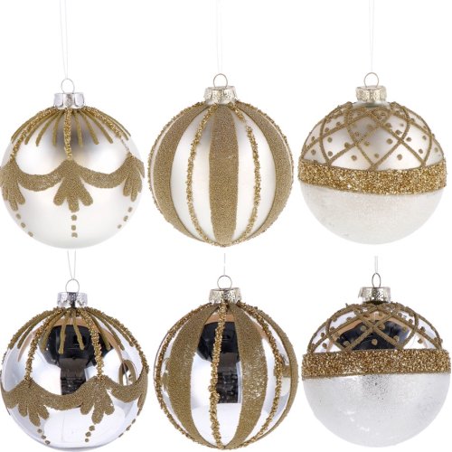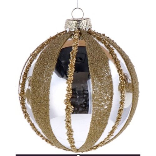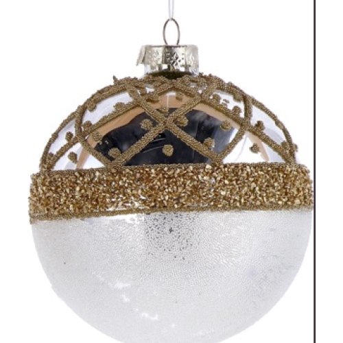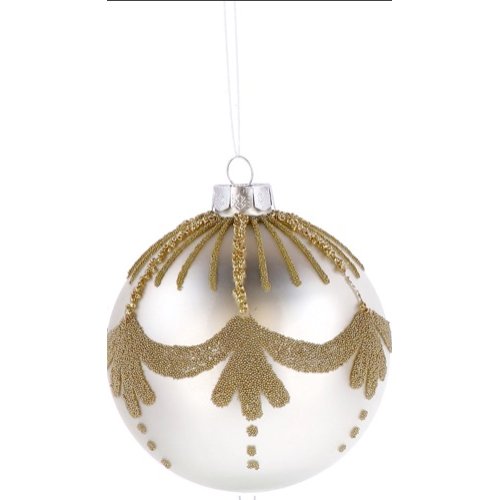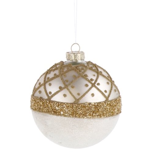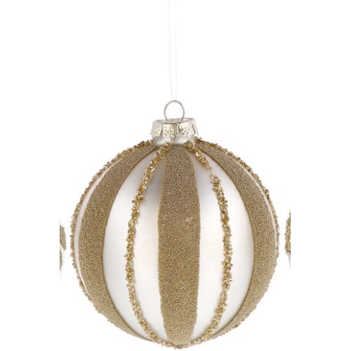 Eleganza e raffinatezza si fondono in questa pallina natalizia in vetro effetto perla, arricchita da pregiati dettagli dorati che donano luce e prestigio al tuo albero di Natale.