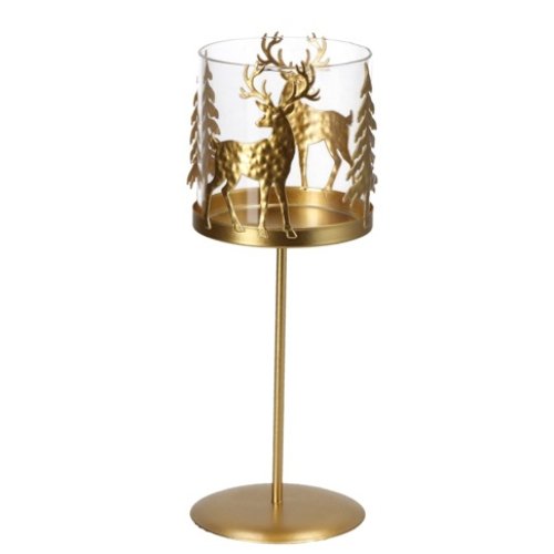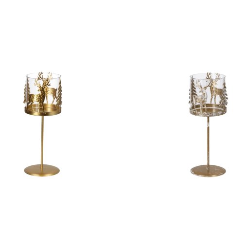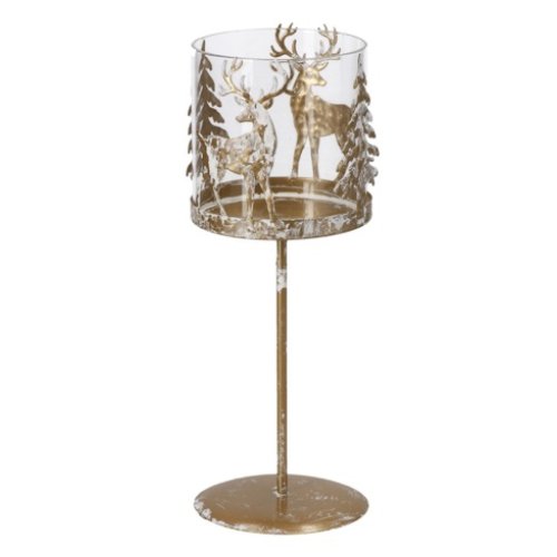 Scalda l’atmosfera della tua casa con stile grazie a questo elegante portacandela decorativa con supporto in ferro e contenitore in vetro, parte della Linea Natalizia.