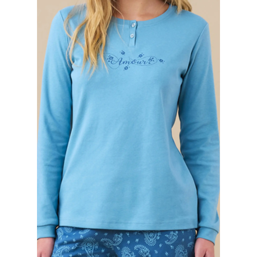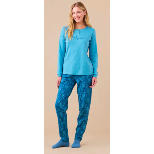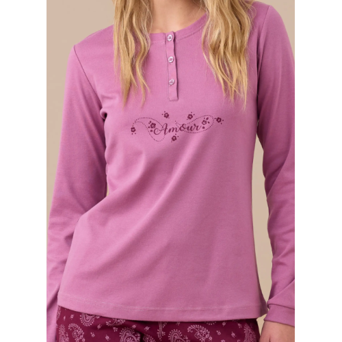 Pigiama donna in caldo cotone con top unito a due bottoni con dettaglio scritta stampata e pantaloni con stampa cachemire.