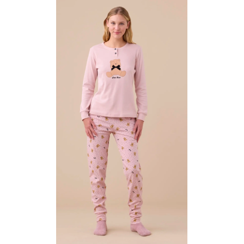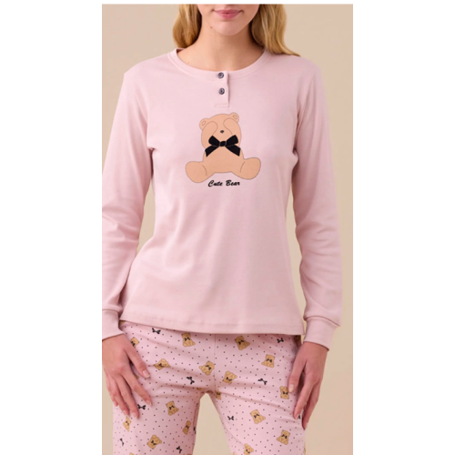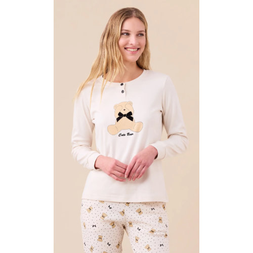 Pigiama donna in caldo cotone con stampa orsi e fiocchi. Top con due bottoni e applicazione con orso e fiocco in velluto e pantaloni con tasche e polsini sul fondo.