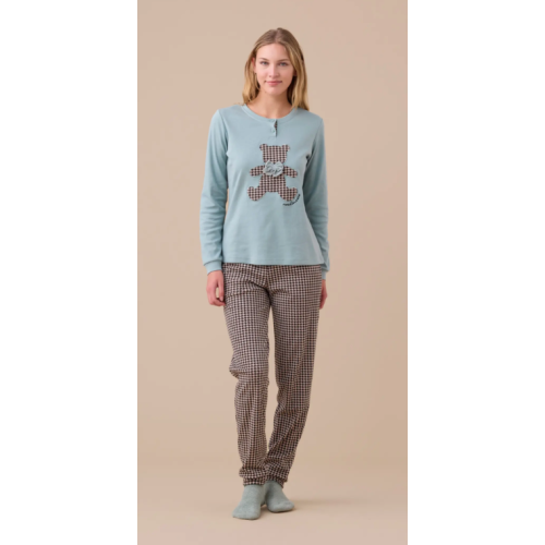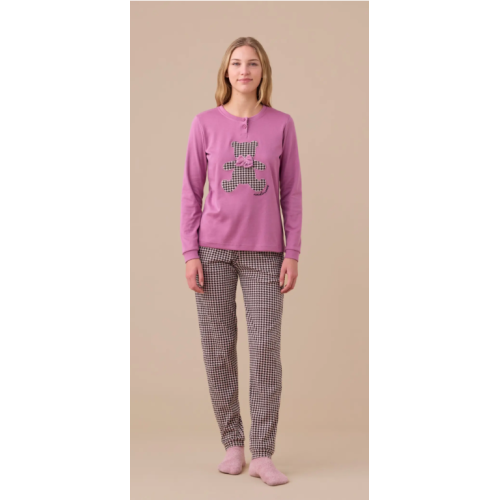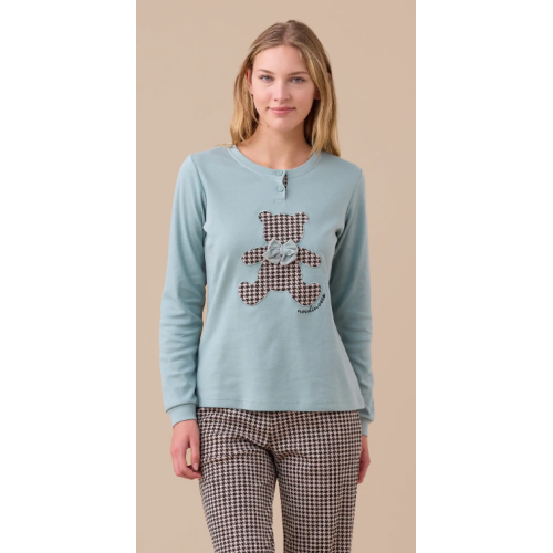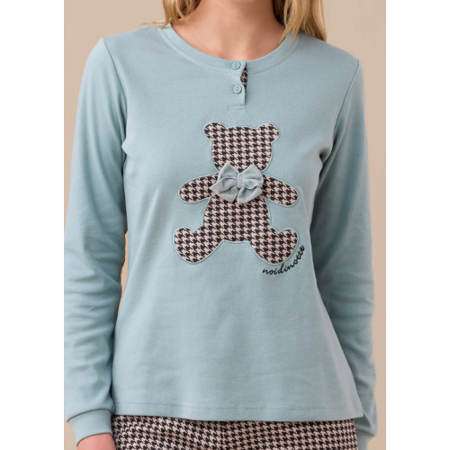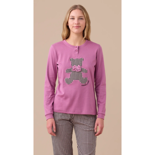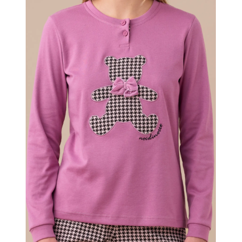 Pigiama donna in caldo cotone con top unico e orso applicato con stampa pied de poule e fiocco in velluto. Pantaloni stampati con polsini.