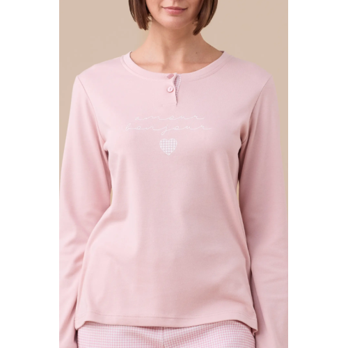 Pigiama donna in caldo cotone con stampa pied de poule. Top a due bottoni con scritta applicata e pantaloni con polsino sul fondo.