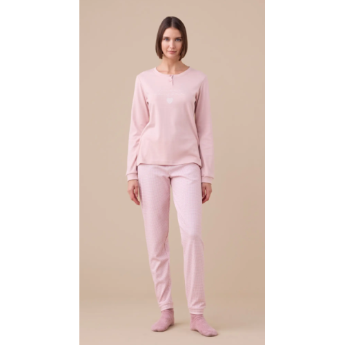 Il pigiama da donna in caldo cotone con stampa "poule" FA9188 del marchio Noi di Notte è un completo elegante e confortevole, ideale per le stagioni più fresche. Disponibile in diverse varianti di colore, offre un mix di comfort e stile.