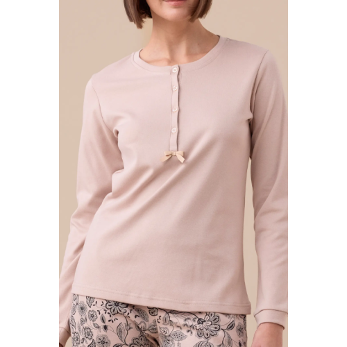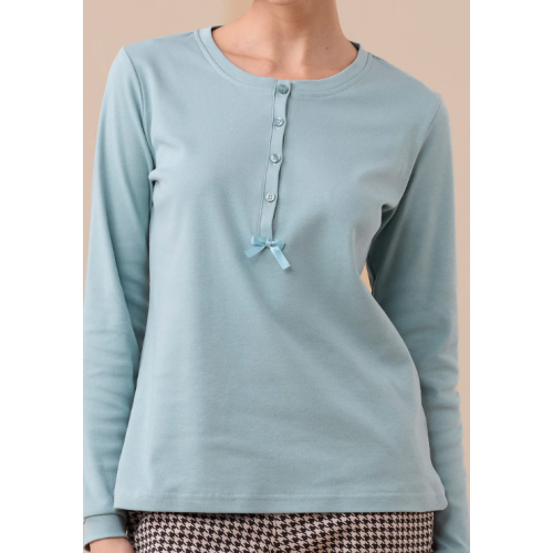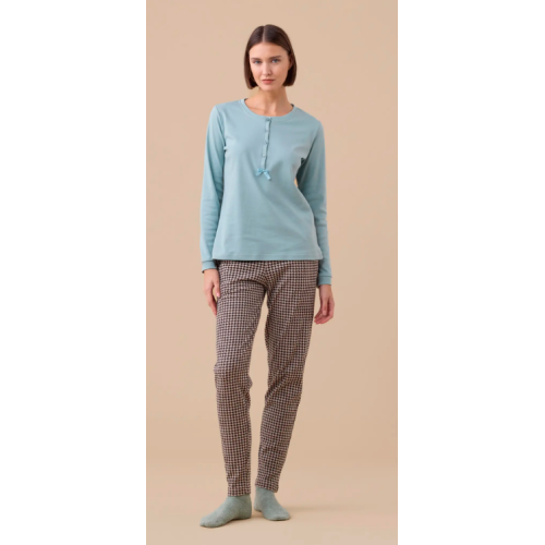 Pigiama donna in caldo cotone. Top unito con collo quattro bottoni e pantaloni stampati con polsini.