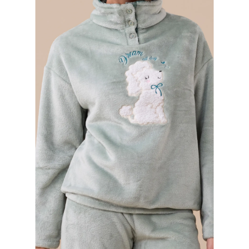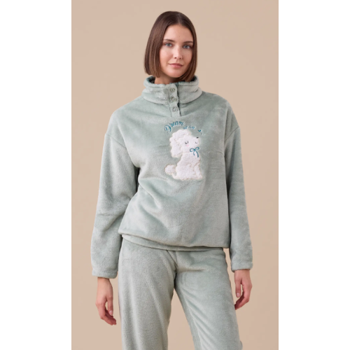 Pigiama donna in morbido coral fleece, caldo e avvolgente, perfetto per le stagioni fredde. Il completo è composto da maglia manica lunga con simpatica stampa o ricamo a tema barboncino sul davanti, abbinata a pantaloni lunghi in tinta coordinata. Il tessuto coral è soffice al tatto, garantendo comfort e calore durante tutta la notte.