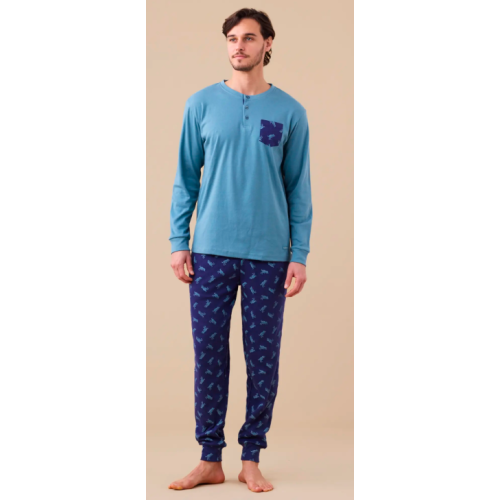 Pigiama uomo in caldo cotone, top di colore unito con collo a tre bottoni e pantaloni in stampa t-rex con polsino.