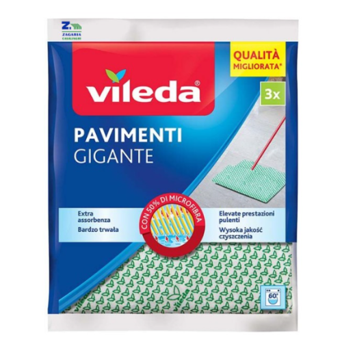 Dopo l'uso non lascia pelucchi ed aloni sul pavimento. Il suo maxi formato (50x60cm) rende la pulzia del pavimento molto più rapida. Terminate le attività di pulizia potrai facilmete lavare il panno Pavimenti Gigante di Vileda in lavatrice.