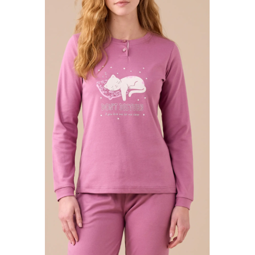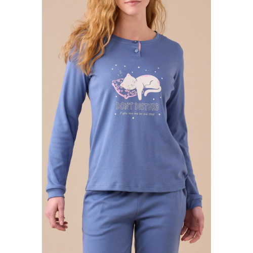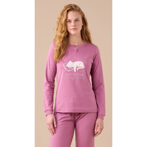 Pigiama donna in caldo cotone unito con top a due bottoni e stampa gatto. Pantaloni uniti con tasche e polsini.