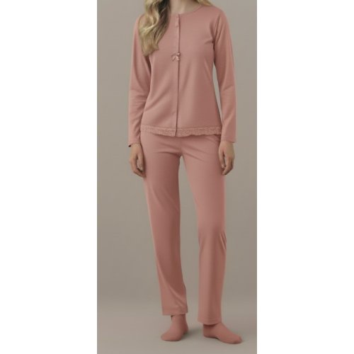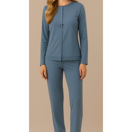 Il completo, composto da una maglia a maniche lunghe e pantaloni coordinati, offre una vestibilità naturale e piacevole sulla pelle, garantendo libertà di movimento e comfort durante il sonno e il relax.