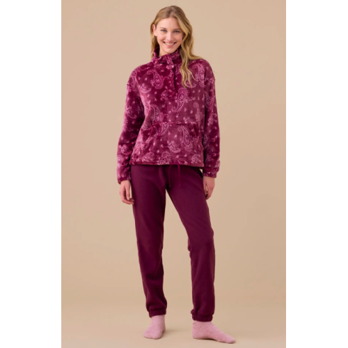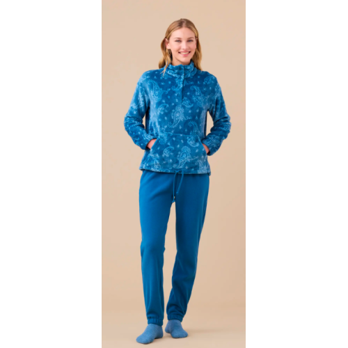 Pigiama donna modello FA009383, realizzato in coral fleece ultra morbido, ideale per garantire calore e comfort durante i mesi più freddi. Il capo si distingue per la sua elegante fantasia cachemire, che dona un tocco raffinato e femminile, perfetto per chi ama sentirsi comoda senza rinunciare allo stile.