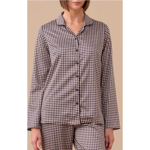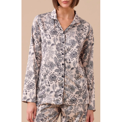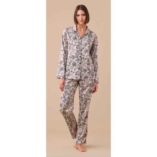 Pigiama donna in raso con top taglio uomo con abbottonatura sul davanti, stampa floreale e profili a contrasto. Pantaloni stampati.