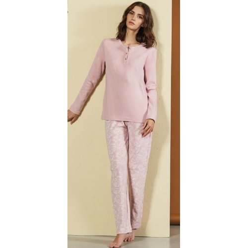 Il Pigiama Donna Serafino 96884 è pensato per offrire il massimo del comfort durante le notti più fresche, senza rinunciare allo stile. È composto da una maglia a manica lunga con scollo serafino (bottoncini sul davanti) e pantaloni lunghi coordinati, perfetti per il relax serale o il riposo notturno. Realizzato in tessuto morbido e traspirante, avvolge il corpo con una vestibilità comoda e piacevole.