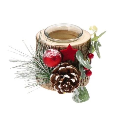 Il suo design rustico e raffinato, unito al legno naturale, crea un’atmosfera intima e festosa, ideale per valorizzare candele profumate o classiche. Con un diametro di 14 cm e un’altezza di 8 cm, è un complemento d’arredo versatile e stabile, adatto sia come decorazione autonoma sia come parte di un centro tavola natalizio.