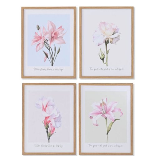 4 quadri decorativi con illustrazioni floreali eleganti in stile acquerello, ideali per donare un tocco romantico e naturale a ogni ambiente della casa. Ogni stampa presenta un delicato fiore con una frase ispirazionale nella parte inferiore, inserita in una cornice effetto legno chiaro che valorizza i colori e lo stile dell'immagine.