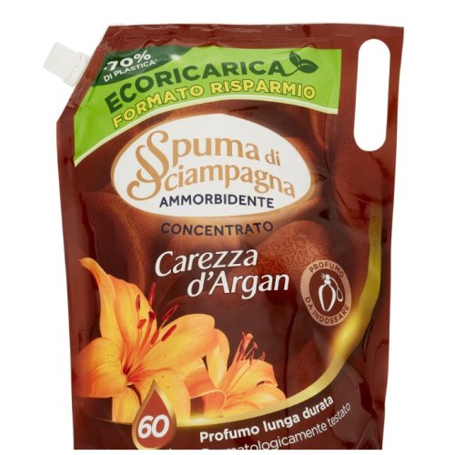 Spuma di Sciampagna Ammorbidente Concentrato Carezza d’Argan è un ammorbidente di alta qualità, formulato con estratti di olio di Argan per donare ai tessuti una morbidezza setosa e un profumo intenso e persistente.