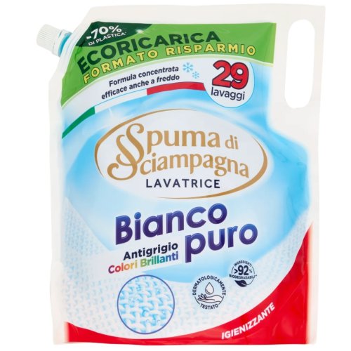 La ricarica ecologica di Spuma di Sciampagna Bianco Puro è un detersivo liquido concentrato studiato per mantenere il bianco brillante e i colori vivi dei tessuti, contrastando efficacemente l’ingrigimento dei capi.