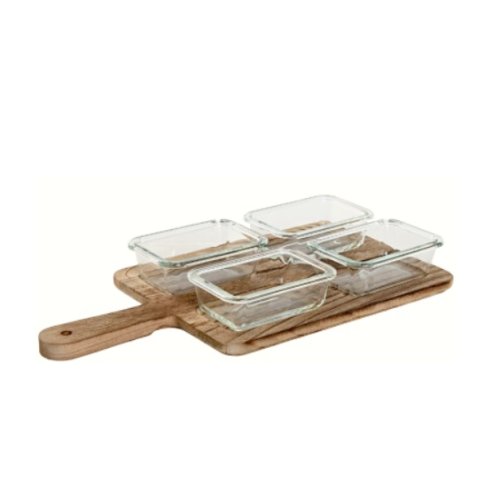 Rendi i tuoi momenti conviviali ancora più speciali con questo elegante set aperitivo composto da 4 ciotoline in vetro trasparente e un vassoio in legno naturale. Perfetto per servire salse, snack, olive o piccoli stuzzichini durante feste e aperitivi.