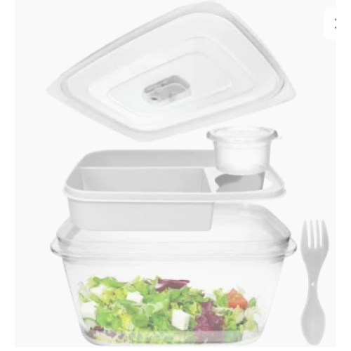 Materiali: corpo in plastica alimentare (es. polipropilene PP) o materiale composito idoneo al contatto alimentare; coperchio dotato di guarnizione in silicone per miglior tenuta; le posate sono realizzate in plastica rigida o in acciaio/plastica combinata.
