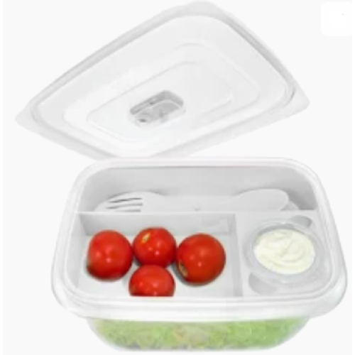 Contenitore porta‑pranzo rettangolare in plastica monouso/riutilizzabile con set posate incluso, dimensioni 19 × 19 × h 8 cm, realizzato in materiale alimentare sicuro, chiusura ermetica.