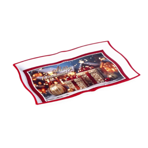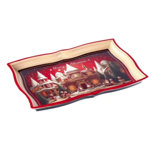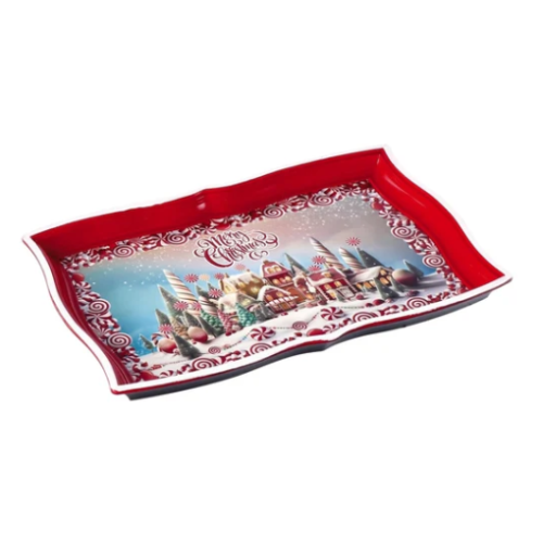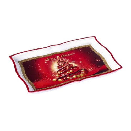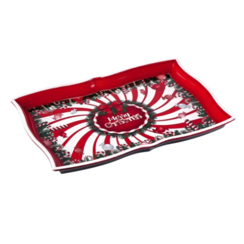Vassoio rettangolare in plastica a tema natalizio, decorato con 6 motivi festivi. Con dimensioni di 35×23×h2 cm, è ideale per servire dolci, biscotti o snack durante le festività. Realizzato in materiale resistente e leggero, unisce funzionalità e stile natalizio, aggiungendo un tocco di allegria e colore alla tavola.