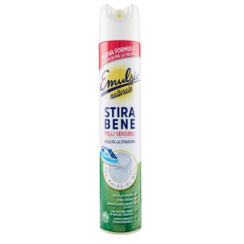 Stirare diventa più facile e delicato con Emulsio Stira Bene Pelli Sensibili, l’appretto spray studiato per chi ha la pelle delicata. La sua formula con amido di mais naturale distende i tessuti e facilita la stiratura, eliminando pieghe e grinze senza lasciare aloni.