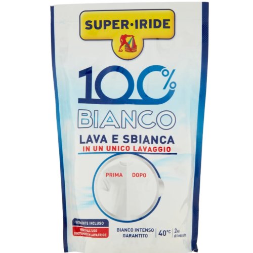 Super Iride 100% Bianco è il detergente colorante specifico per tessuti bianchi che lava e sbianca in un unico lavaggio, garantendo un bianco intenso e brillante.